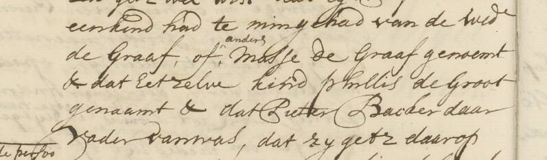 Rigt said she breastfed a child from the widow de Graaf, or otherwise called Masje de Graaf, and that the child's name was Phillis de Groot and Pieter Backer was the father of it (Amsterdam City Archives)