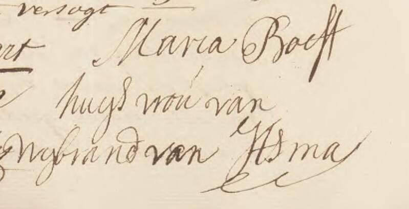 Maria is described as Maria Boeff, from Oostflieland, currently living on the Singel. The bride-to-be still had the status as widow of Jacob de Graaff. Although her mother Evertje was still alive, it is not stated who is assisting Maria (or Marja - as her signature says). This is because there did not have to appear a witness in case of the marriage of a widow.