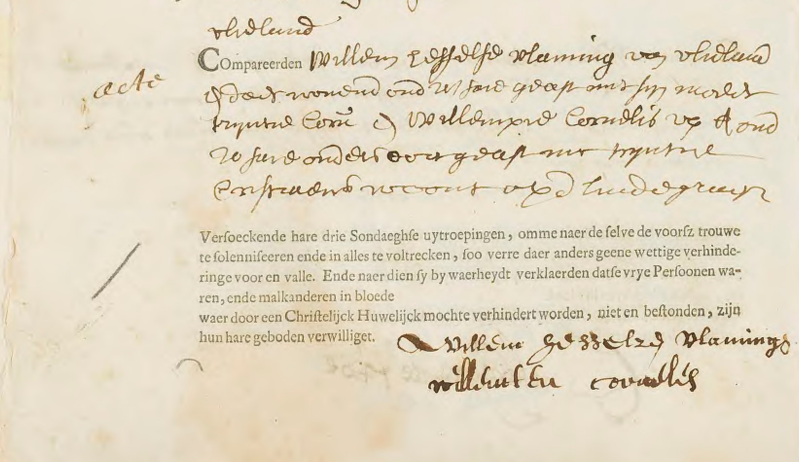 This certificate tells us Willem de Vlamingh originally comes from Vlieland and still lives there. And Willempie is said to be from Amsterdam. She lives there on the Lindengracht.