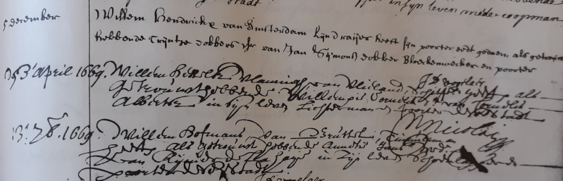 Photograph from the Poorterboeken in the Stadsarchief of Amsterdam of April 3, 1669