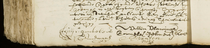 Another clue that convinces us the man in the office of Anthonij van de Ven is our Willem (and not a certain Mr. Blamingh) is the fact that the skipper of 't Wapen van Sweden on which the accident happened was called Cornelis Jelmersz Cock, someone our Willem de Vlamingh worked with regularly. In addition, the name of Louis Quickelenbergh (merchant here) appears in the deed. As will become apparent in the next chapter, he is also an old acquaintance of Willem de Vlamingh.
